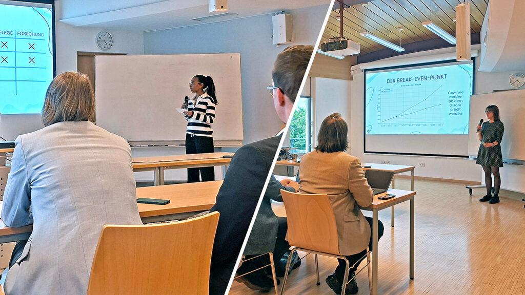 Bei der Abschlussveranstaltung zum „Großen Businessplan“ am 16. Juli standen den Studierenden insgesamt vierzig Minuten Zeit zur Verfügung, um ihr finales Produktkonzept ausführlich vorzustellen. Erste Ergebnisse aus der Gruppenarbeit waren bereits am 4. Juni im Rahmen des „Kleinen Businessplans“ präsentiert worden. Die weitere Arbeitsphase diente dazu, das Konzept auf Basis des erhaltenen Feedbacks von Dozenten und Vertreter*innen der Unternehmen weiter zu schärfen sowie einen konkreten Finanzplan zu integrieren, der aufzeigen soll, wie sich aus der Idee tatsächlich ein tragfähiges Geschäftsmodell entwickeln ließe.