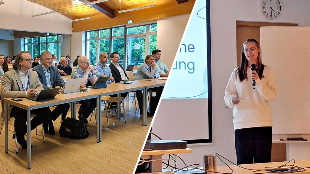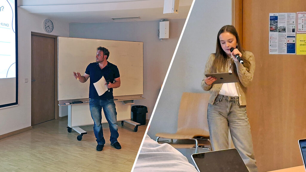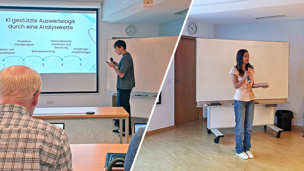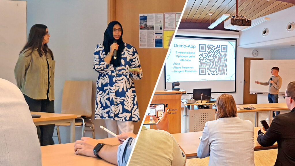 Team 6 – Marktanalyse und Kompilat führte maßgeblich durch die Präsentation. Vortragende aus den anderen fünf Teams übernahmen die Darstellung der Details zu technischer Umsetzung, Datenanalyse, App-Design, Nutzerakzeptanz und Ethik. Zunächst stellten die Teams vor, welche Vorteile eine nicht-invasive Messmethode, die für den alltäglichen Gebrauch geeignet ist, für Patient*innen mit Diabetes mellitus II, aber auch für andere Anspruchsgruppen wie medizinisches oder pflegerisches Personal, mit sich bringen würde. Darauf folgte die Vorstellung des konkreten Produkts, einer Glukosemessuhr für das Handgelenk in Verbindung mit einer App zur Datenauswertung und -übertragung, sowie die Darstellung der Marketing- und Preisstrategie auf Basis der zugrundeliegenden Gesamtkostenplanung. Die Teams präsentierten eine erste Demo-App und erläuterten, welche Daten für welche Anspruchsgruppe relevant und zugänglich sein sollten. So könnten die Nutzer*innen-Daten beispielsweise auch der Forschung zugänglich gemacht werden, jedoch nur in aggregierter, anonymisierter Form. Auch medizinethische Aspekte und rechtliche Anforderungen wurden berücksichtigt. Abschließend stellten die Studierenden die Marktsituation sowie aktuell erhältliche Konkurrenzprodukte dar und erläuterten mittels einer SWOT-Analyse die Stärken, Schwächen, Herausforderungen und Chancen der eigenen Produktinnovation.